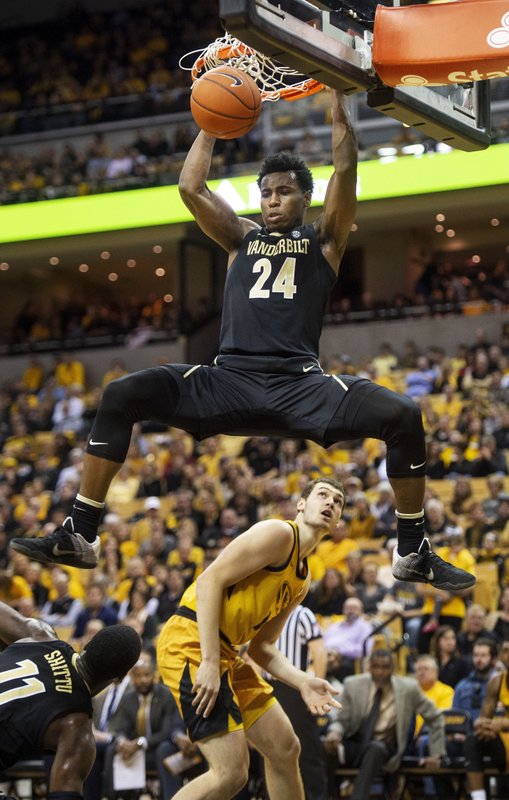 AP photo Vanderbilt's Aaron Nesmith (24) dunks the ball over Missouri's Reed Nikko, bottom, during a game last February. Nesmith was taken No. 14 by the Celtics in the NBA Draft Wednesday night.