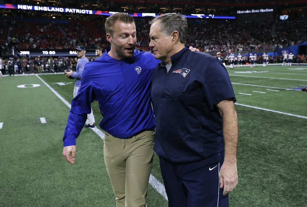 Rams coach Sean McVay and Patriots coach Bill Belichick chat before the two teams met in the Super Bowl in Atlanta two years ago.(AP file photo)