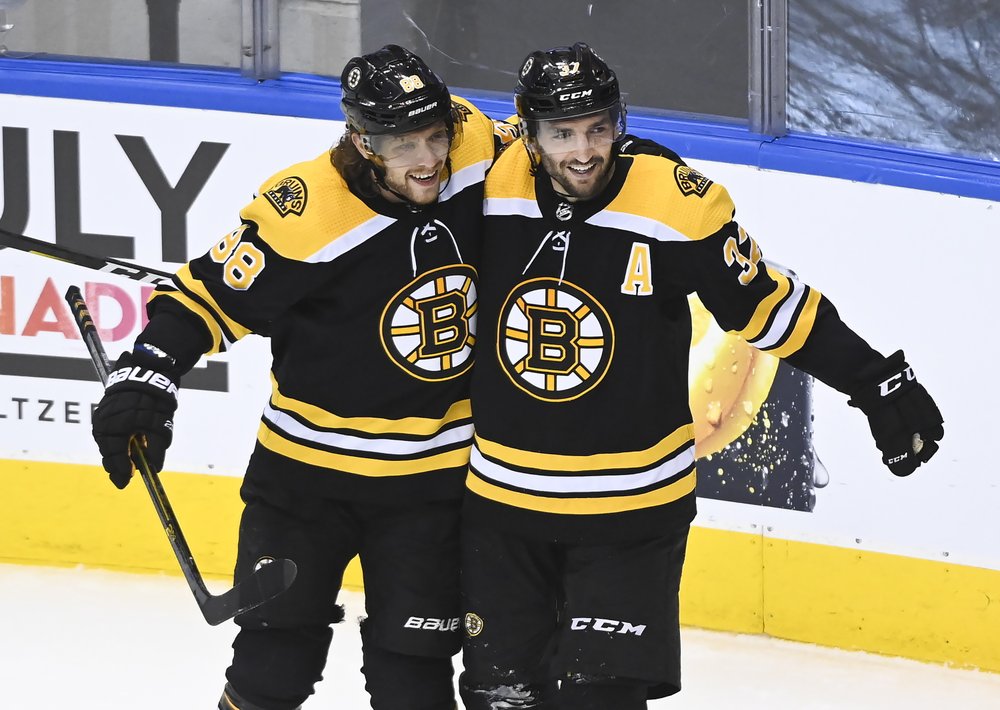 When will the Bruins' David Pastrnak, left, and Patrice Bergeron celebrate a goal together again? In mid-January, as the NHL made it official Sunday that the season will start on Jan. 13. (AP photo)