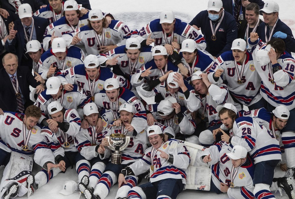 United States players poured over the bench when the buzzer sounded, tossing sticks and gloves aloft in a mostly empty Rogers Place. The tournament was played with no fans in the stands to prevent the spread of COVID-19.