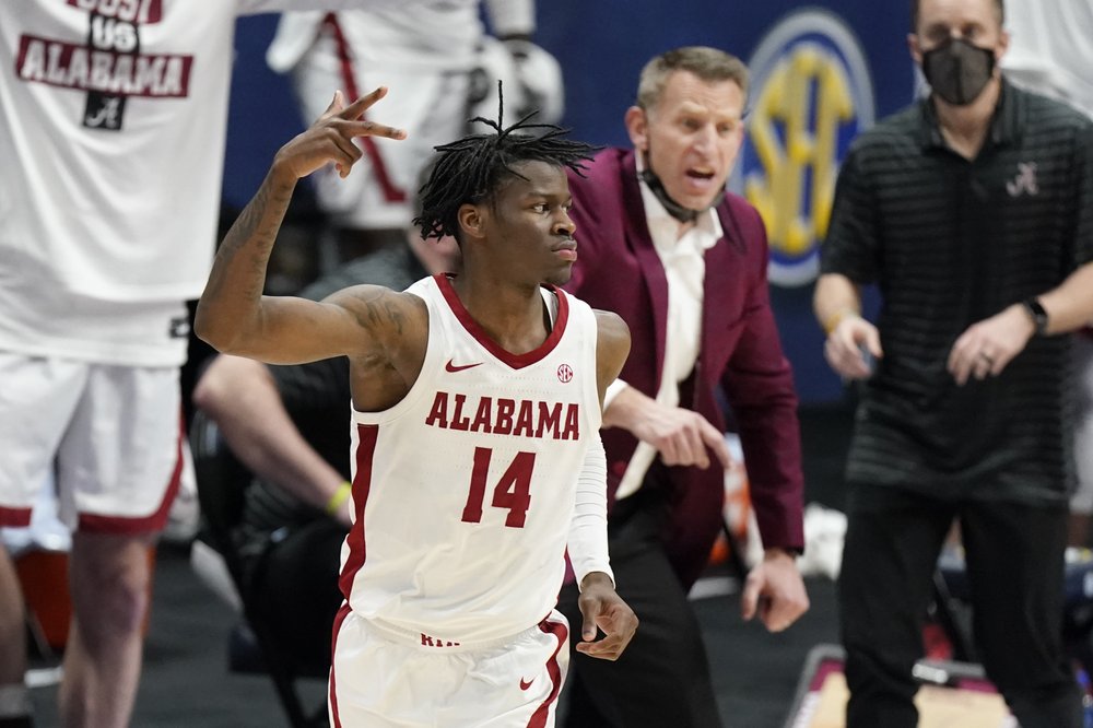 Alabama's Keon Ellis (14) celebrates after scoring against LSU during the second half of the championship game at the Southeastern Conference Tournament last Sunday, (AP photo)