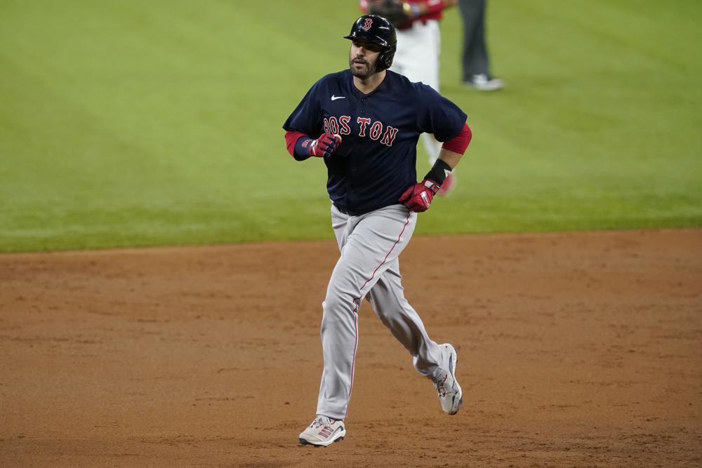 Boston Red Sox's J.D. Martinez runs the bases after hitting a solo home run off Texas Rangers starting pitcher Kohei Arihara, Martinez's second homer of the night, during the third inning of Friday night's Sox win in Arlington, Texas. (AP photo)