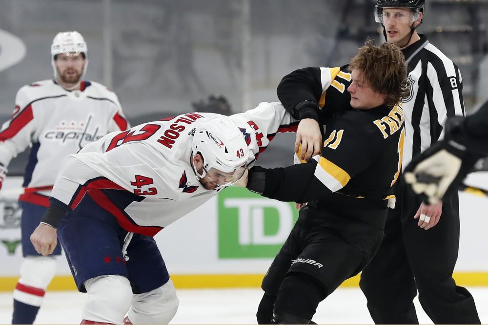 Boston Bruins' Trent Frederic (11) and Washington Capitals' Tom Wilson (43) fight during the third period of a game in Boston, in this Friday, March 5, 2021, file photo. The Boston Bruins and Washington Capitals already have bad blood built up going into their first-round playoff series that starts tonight. Game 1 will be Boston defenseman Brandon Carlo's first time on the ice against Tom Wilson since the Washington forward concussed him with a hit in March that drew a seven-game suspension. (AP photo)