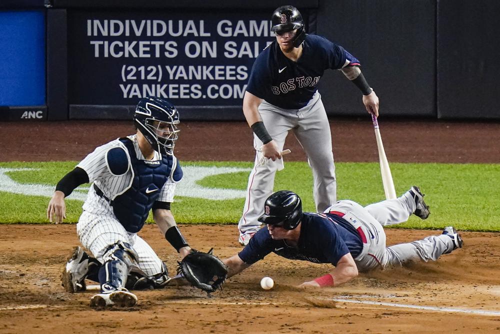 Boston Red Sox's Christian Vazquez, top right, watches as Hunter Renfroe, bottom right, slides past New York Yankees catcher Gary Sanchez, left, to score on a double by Red Sox's Marwin Gonzalez during the sixth inning of Friday night's game in New York. (AP photo)