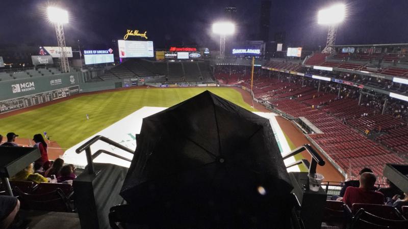 The delay was announced about a half-hour before the scheduled start as dark clouds moved over Fenway Park, with weather radar showing heavy storms coming from the west.