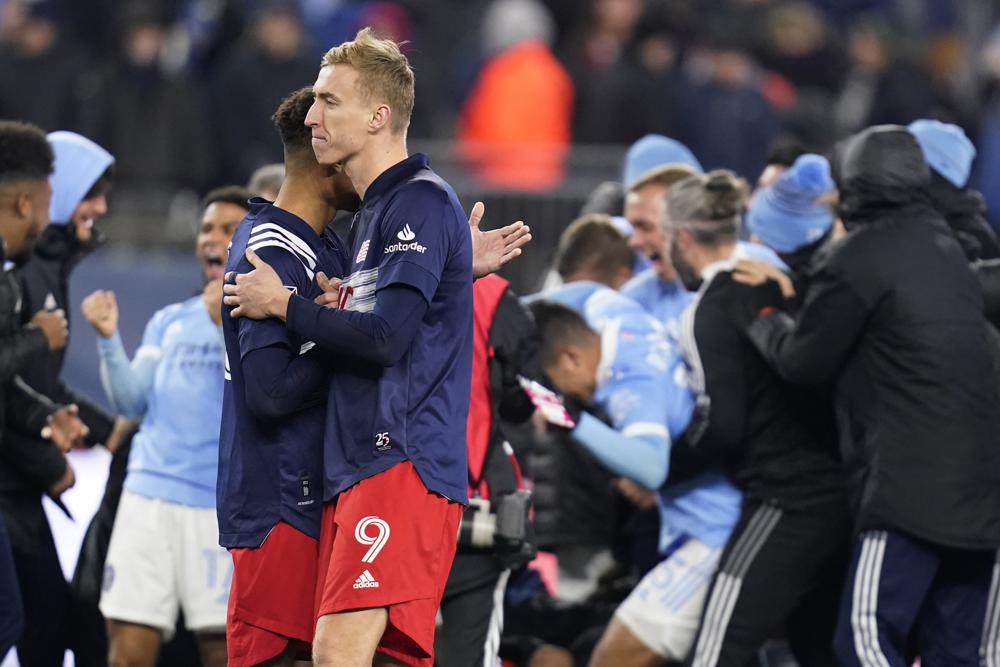 New England Revolution forward Adam Buksa (9) is embraced by midfielder Brandon Bye after the team's 3-2 loss to New York City FC in an MLS playoff soccer match Tuesday at Gillette Stadium. (AP photo)