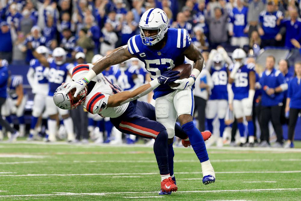 Indianapolis Colts outside linebacker Darius Leonard (53) pushes away New England Patriots wide receiver Jakobi Meyers after intercepting a pass during the first half of Saturday night's game in Indianapolis. (AP photo)