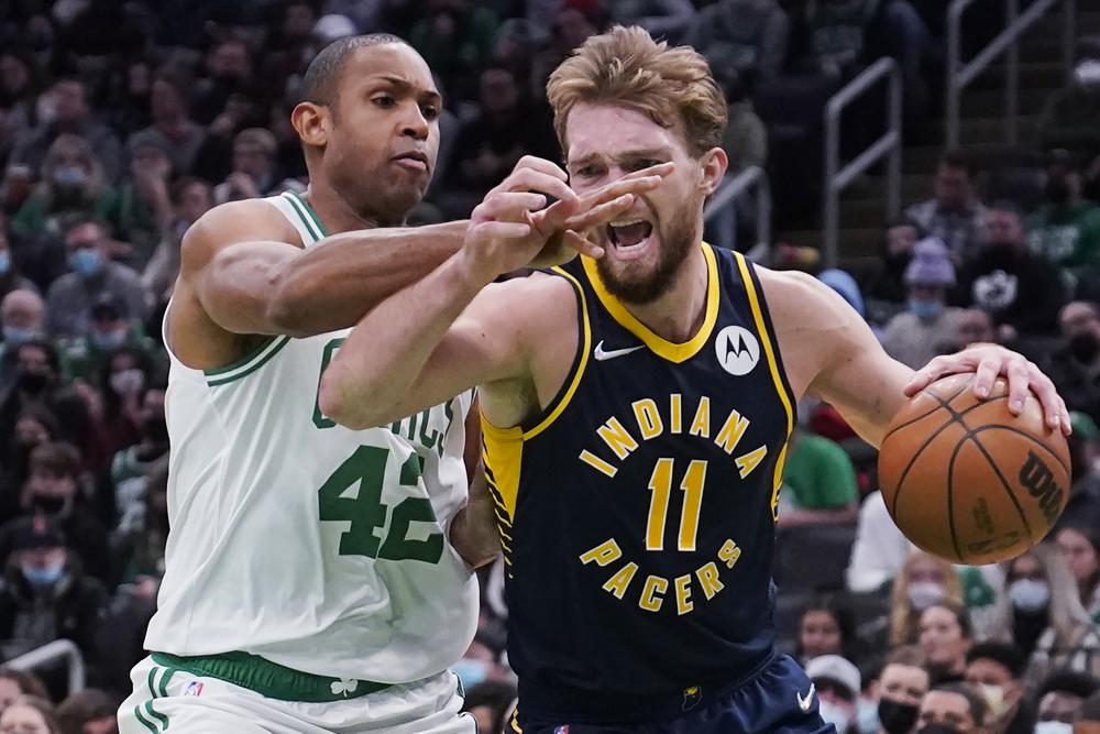 Indiana Pacers forward Domantas Sabonis (11) tries to drive past Boston Celtics center Al Horford (42) during the second half of Wednesday night's game in Indianapolis. (AP photo)
