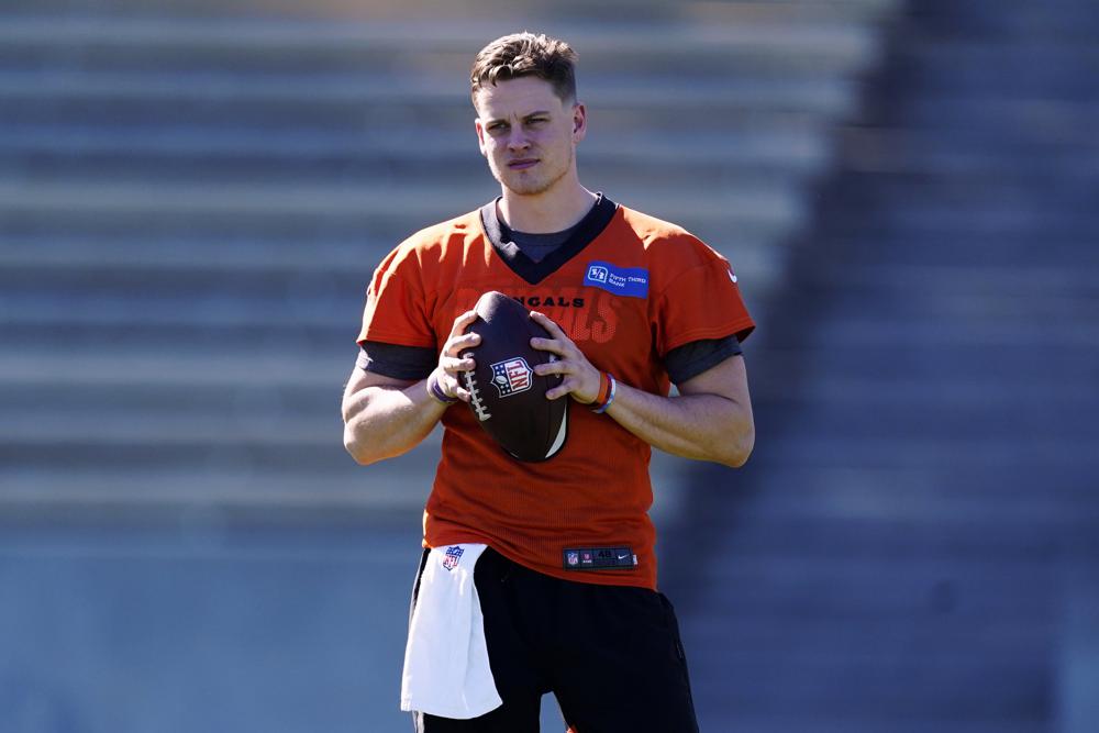 Cincinnati Bengals quarterback Joe Burrow warms up during practice this week for Super Bowl LVI in Los Angeles. (AP photo)