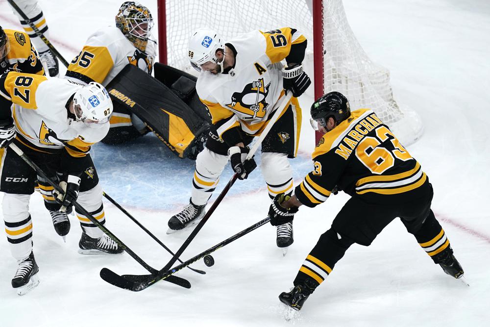 Pittsburgh Penguins defenseman Kris Letang (58) and center Sidney Crosby (87) stop a shot by Boston Bruins left wing Brad Marchand (63) after Pittsburgh Penguins goaltender Tristan Jarry lost his balance during the first period of an NHL hockey game back on Feb. 8, (AP photo)