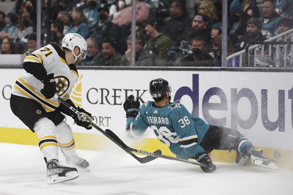 Patrice Bergeron also scored for Boston, which beat San Jose for the ninth straight time. The Sharks’ last win against the Bruins came on March 15, 2016.