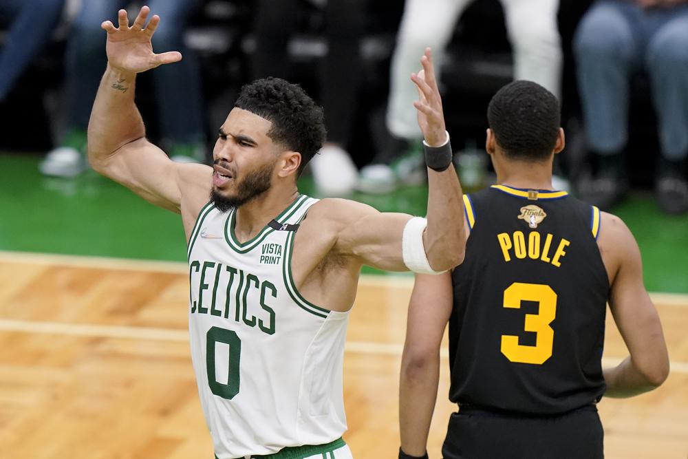 Boston Celtics forward Jayson Tatum (0) reacts during the fourth quarter of Game 4 of the NBA Finals against Golden State Warriors, Friday at TD Garden. (AP photo)