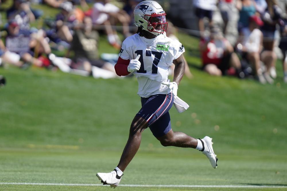 New England Patriots wide receiver Kristian Wilkerson performs field drills during training camp at the NFL football team's practice facility, Wednesday in Foxborough. (AP photo)