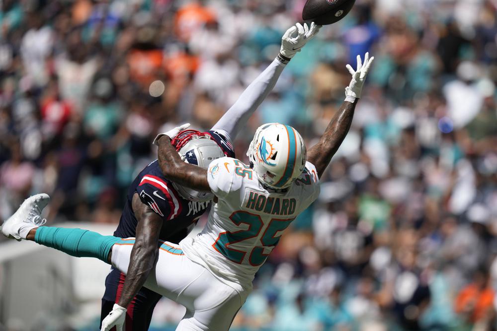 Miami Dolphins cornerback Xavien Howard (25) defends New England Patriots wide receiver DeVante Parker (1) during the second half of Sunday's game in Miami Gardens. (AP photo)