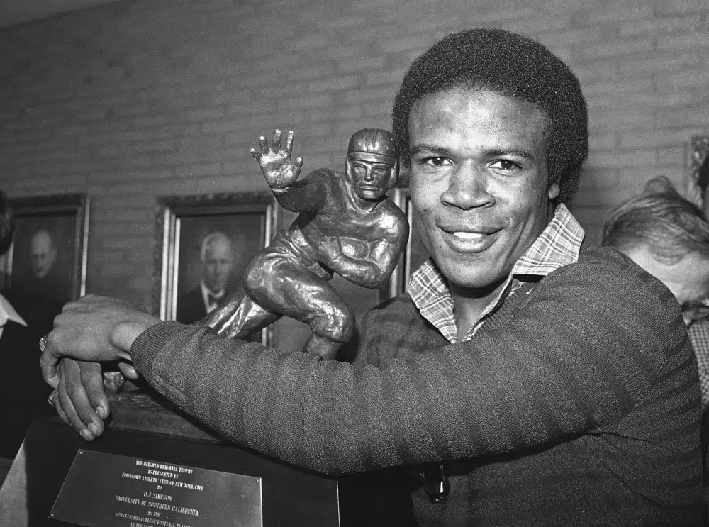 Southern California tailback Charles White puts his arms around the Heisman Trophy won by O.J. Simpson in 1968 after White was announced as the winner of the 1979 Heisman Trophy, Dec. 3, 1979, in Los Angeles. White died Wednesday, Jan. 11, 2023. He was 64. USC announced the death of White, who is still the Trojans' career rushing leader with 6,245 yards. The nine-year NFL veteran died of cancer, the school said. (AP photo)