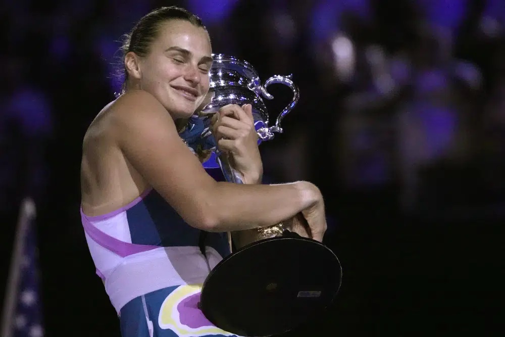 Aryna Sabalenka of Belarus hugs the Daphne Akhurst Memorial Trophy after defeating Elena Rybakina of Kazakhstan in the women's singles final at the Australian Open tennis championship in Melbourne, Australia, Saturday. (AP photo)
