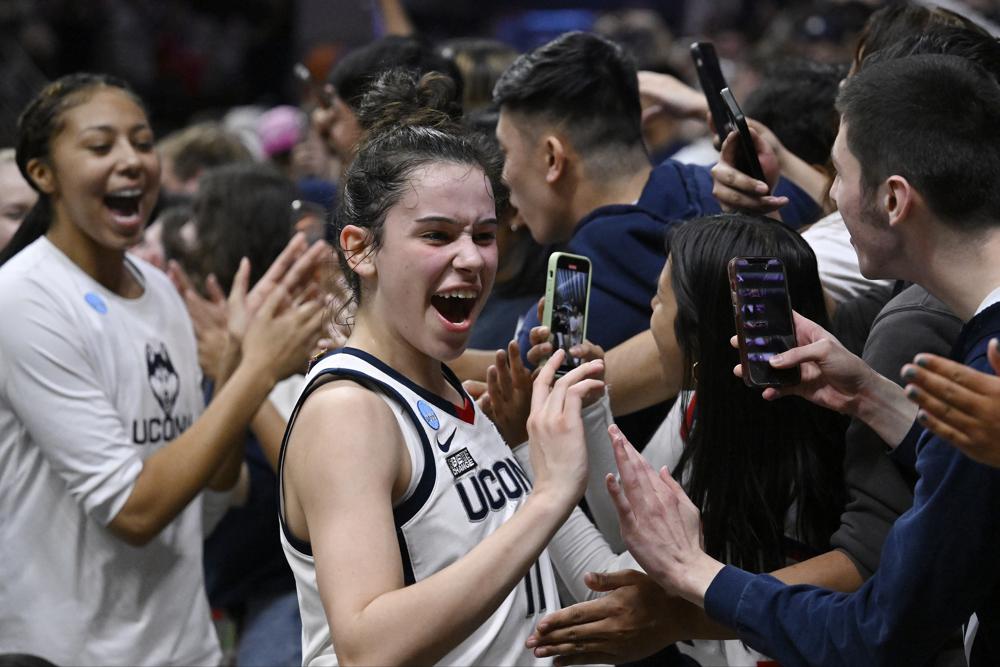UConn's Lou Lopez Senechal (11) celebrates with students after her team's win over Baylor in a second-round college basketball game in the NCAA Tournament this past Monday in Storrs, Conn. (AP photo)