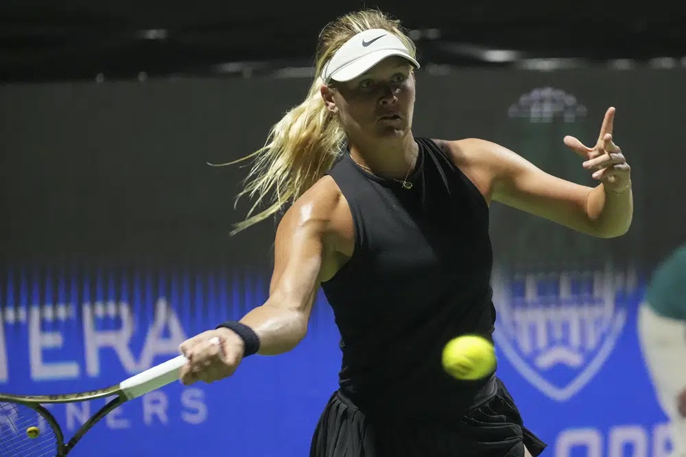 Peyton Stearns returns the ball during her ATX Open tennis match against Mirjam Bjorklund at the Westwood Country Club in Austin, Texas, Wednesday, March 1, 2023. Stearns is playing in the French Open for the first time and now the 21-year-old American is into the third round after knocking off 2017 champion Jelena Ostapenko. Stearns used her big forehand to put together the 6-3, 1-6, 6-2 victory on Wednesday. (AP photo)