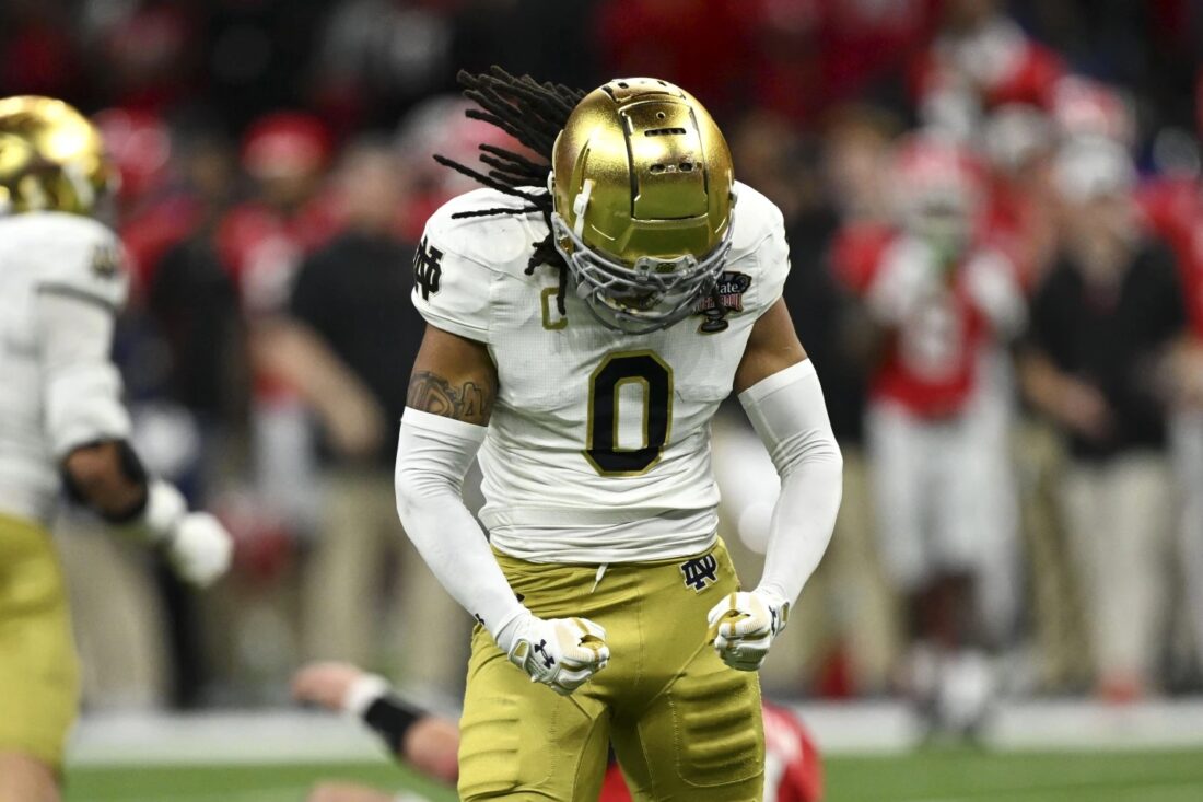 Notre Dame safety Xavier Watts celebrates a defensive stop against Georgia in the CFP quarterfinals last week in New Orleans. (AP photo)