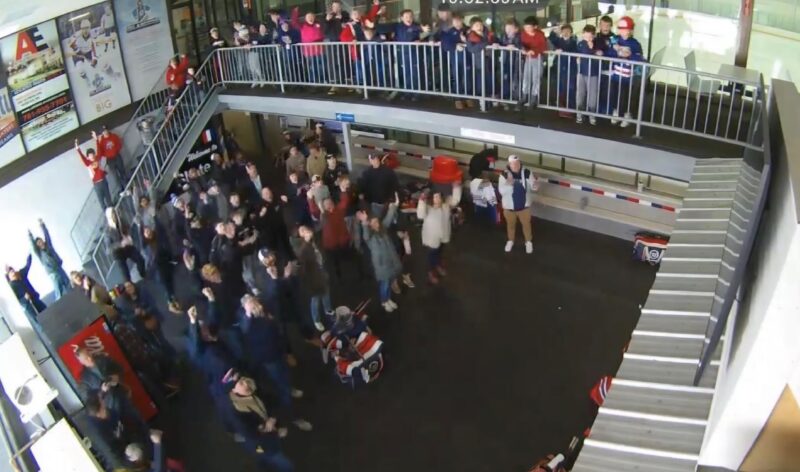 Fans in the lobby at Skate 3 Arena in Tyngsborough, Mass. react to the game-winning goal by Team USA on Sunday. (Photo courtesy of Skate 3)