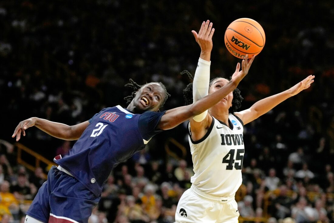 Farleigh Dickinson's Rebcca Osei-Owusu, left, battles Iowa's Hannah Stuelke for the ball during Saturday's first round NCAA Tournament game in Iowa City. (AP photo)