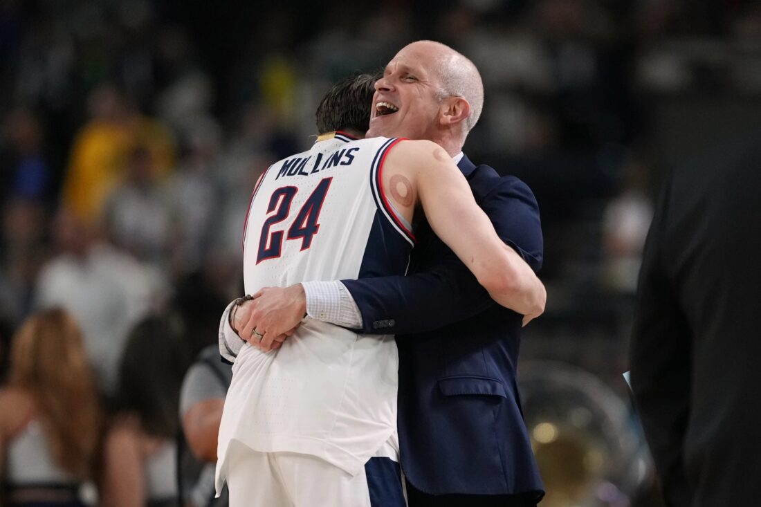 UConn coach Dan Hurley celebrates with the Huskies' Braylin Mullins in the final moments of Saturday's Final Four win over Illinois in Indianapolis. (AP photo)