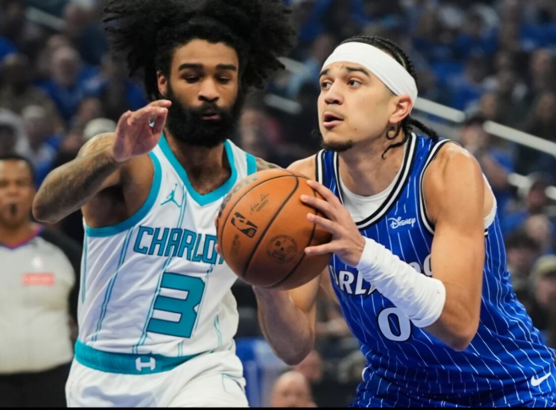 Orlando's Anthony Black drives by Charlotte's Coby White during Friday night's Play-In game in Orlando. (AP photo)