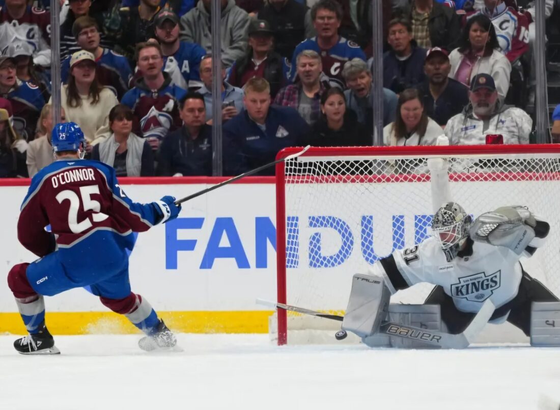 Avs winger Logan O'Connor scores against Kings goalie Anton Forsberg during Game 1 of their first round Stanley Cup Playoff series Sunday in Denver. (AP photo)