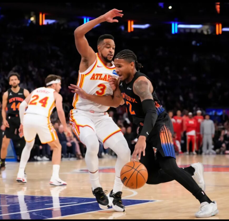 Knicks guard Miles McBride drives on Atlanta's CJ McCollum during Monday night's Game 2 of their Eastern Conference first round playoff series in New York. (AP photo)