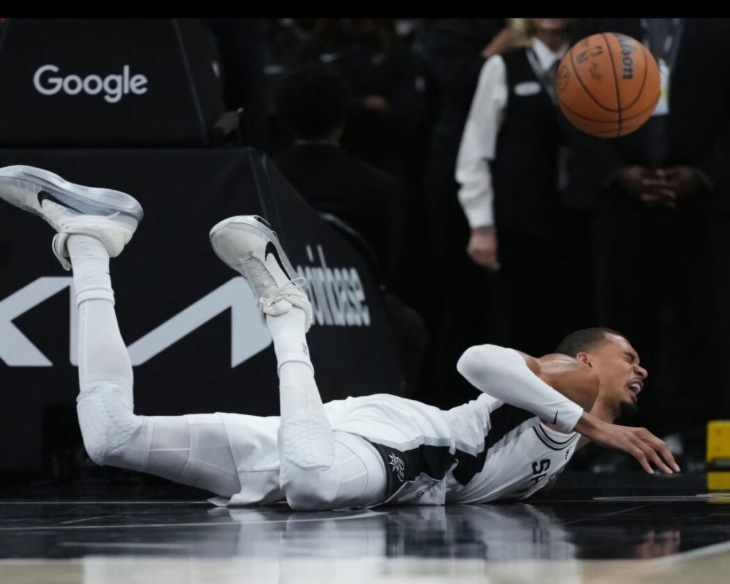 The Spurs' Victor Wembanyama slams to the floor during Tuesday night's playoff game vs. Portland in San Antonio. (AP photo)