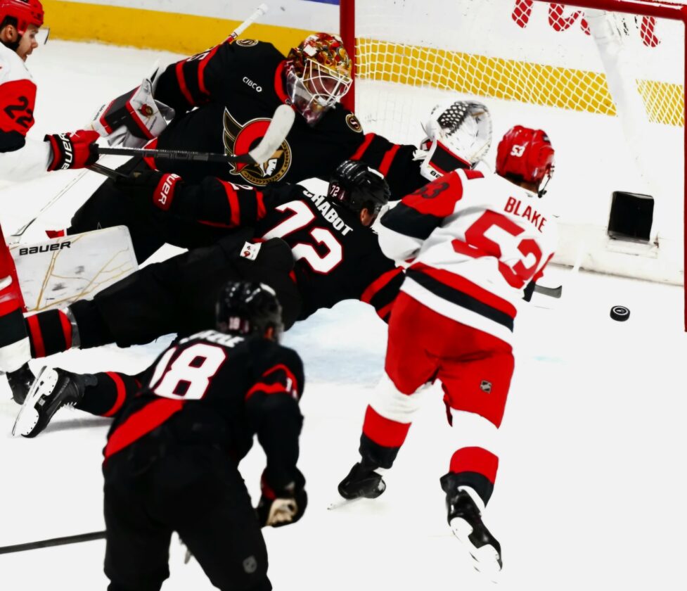 Carolina's Jackson Blake (53) scores on Ottawa goalie Linus Ullmark during Thursday night's Game 3 of their first round Stanley Cup Playoff series in Ottawa. (AP photo)