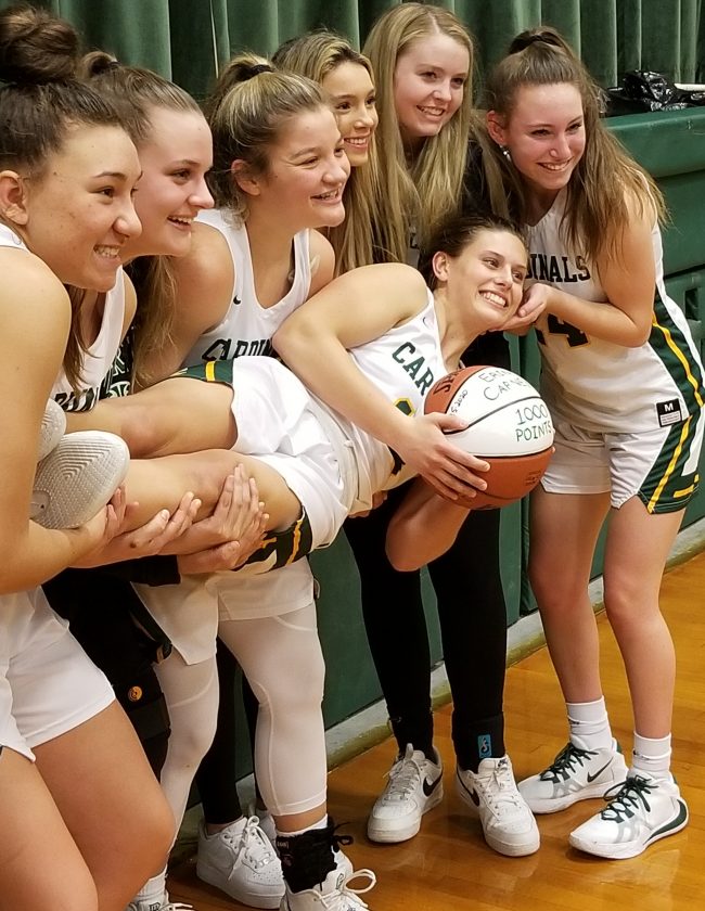 Telegraph photo by TOM KING Bishop Guertin senior Erin Carney is held up by her teammates, celebrating her 1,000th career point after the Cardinals' 68-46 win over Mercy on Saturday.