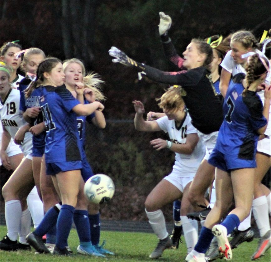 Telegraph photo by TOM KING The ball draws a crowd as Bishop Guertin goalie Erin Morris makes a save in front of Merrimack's Siobhan McMakin (31) and Kailey Dillon during the Cards' 4-1 Divison I play-in win at MHS' Student Memorial Field on Tuesday.