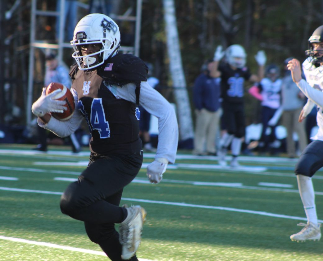 Telegraph photo by TOM KING Hollis Brookline's Marc-Andre Thermitus runs to daylight for one of his two TDs in HB's 33-14 playoff win over Milford Saturday in Hollis.