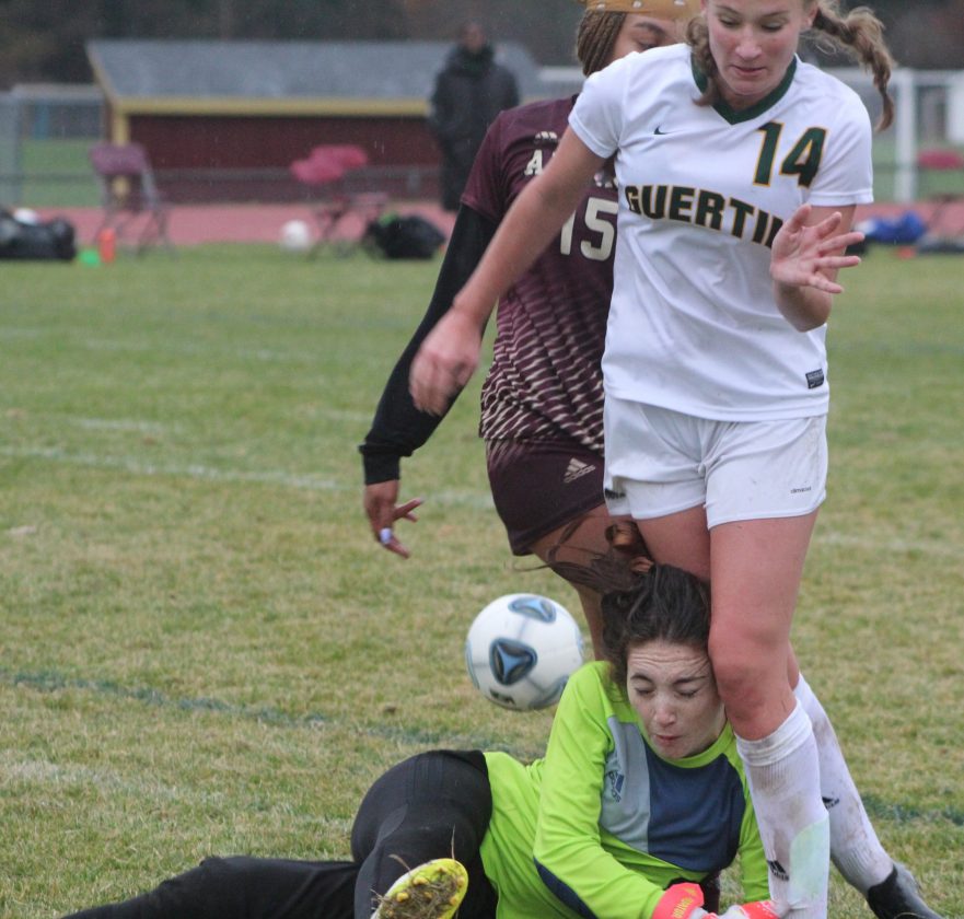 Telegraph photo by TOM KING Alvinre goalie Paige McKinley gets crunched up against Bishop Guertin's Madeline Neily (14) as her Broncos teammate Adrienne McKoy-Sophos looks on during the Cards' dramatic 3-2 overtime win in the Division I quarterfinals in Hudson on Sunday.