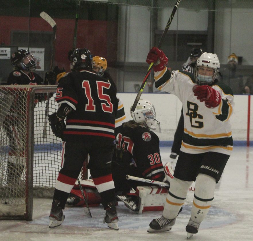 Bishop Guertin's Julie McLaughlin celebrates her goal that gave the Cards the lead for good in a 8-6 comeback win over Berlin-Gorham Wednesday at Hudson's Cyclones Arena. (Telegraph photo by TOM KING)