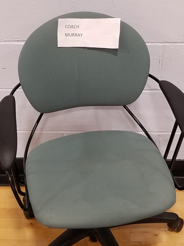 The chair always used by late Milford boys hoop coach Dan Murray remained vacant for Friday's game with Hollis Brookline. (Telegraph photo by TOM KING)