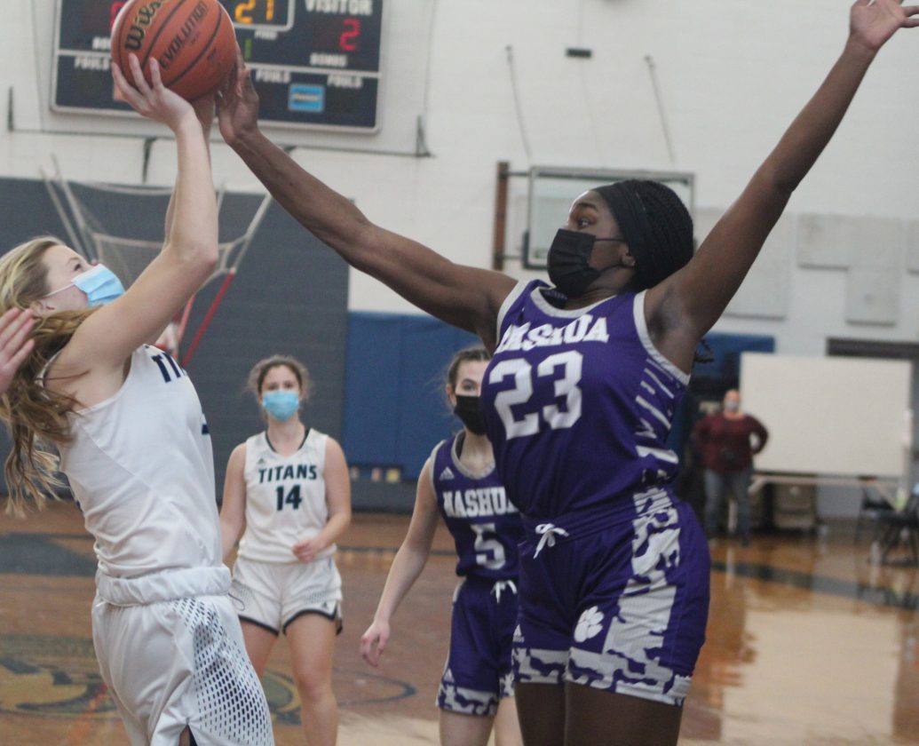 Nashua South's Iruka Obinelo blocks a shot by Nashua North's Lilly Brooks during the Panthers' 19-16 win Saturday at Titans Gym. (Telegraph photo by TOM KING)
