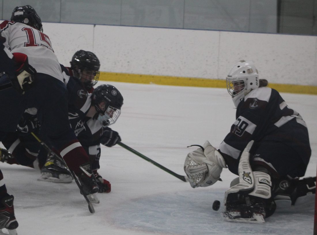 Hollis Brookline-Derryfield's Paul Vachon (15) flips the puck toward Alvirne-Milford goalie Trent Scarbro, who is getting help from Kevin Sullivan (21) during Saturday's gme at Conway Arena. (Telegraph photo by TOM KING)