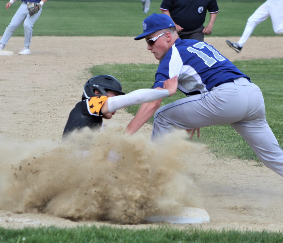 Souhegan's Keegan Burke gets tagged out trying to steal third in a cloud of dust by Hollis Brookline's Zackery Lussier duirng Saturday's 5-2 Sabers win in Amherst. (Telegraph photo by TOM KING)