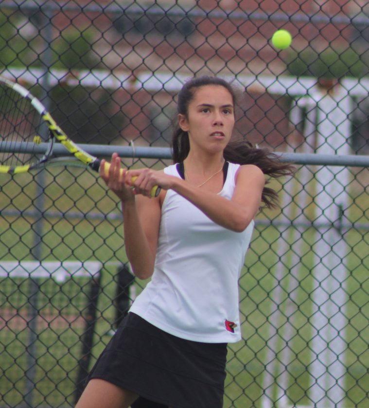 BG swept the abbreviated doubles. Only one match, at No. 3, was played to completion as Linskey/Alexa Pesiridis blanked O’Young/McKenzie Smith at Nol 3, 8-0. The Cards’ No. 1 tandem of Nicols/Gilbertson was up 7-5 on Groh/Milani and No. 2 MacSweeny/Bucci was leading 6-5 over Azevedo/Rane when the courts became too slippery from the light rain and it was agreed to call the matches with the teams ahead declared the winners.