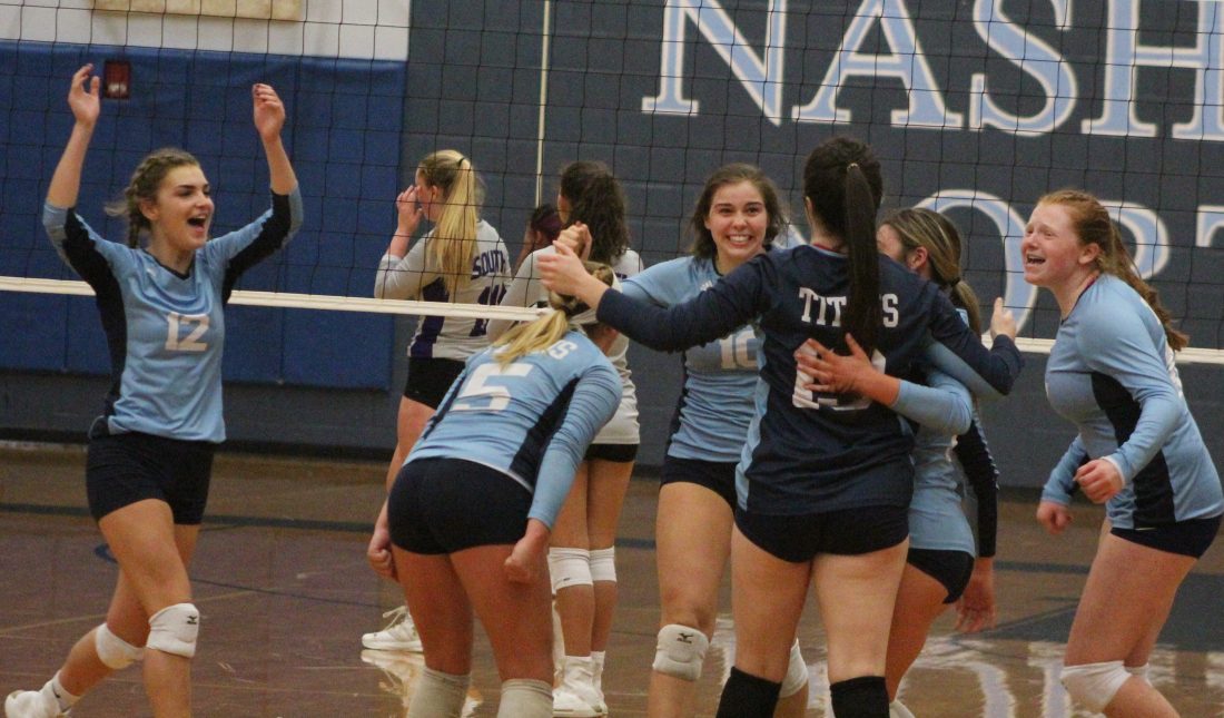 Nashua North volleyball players celebrate a win over Nashua South last fall, when at this time student athletes did not have to wear masks competing. It looked like they would this season until the Board of Education amended its earlier ruling on Monday night. (Telegraph file photo by TOM KING)