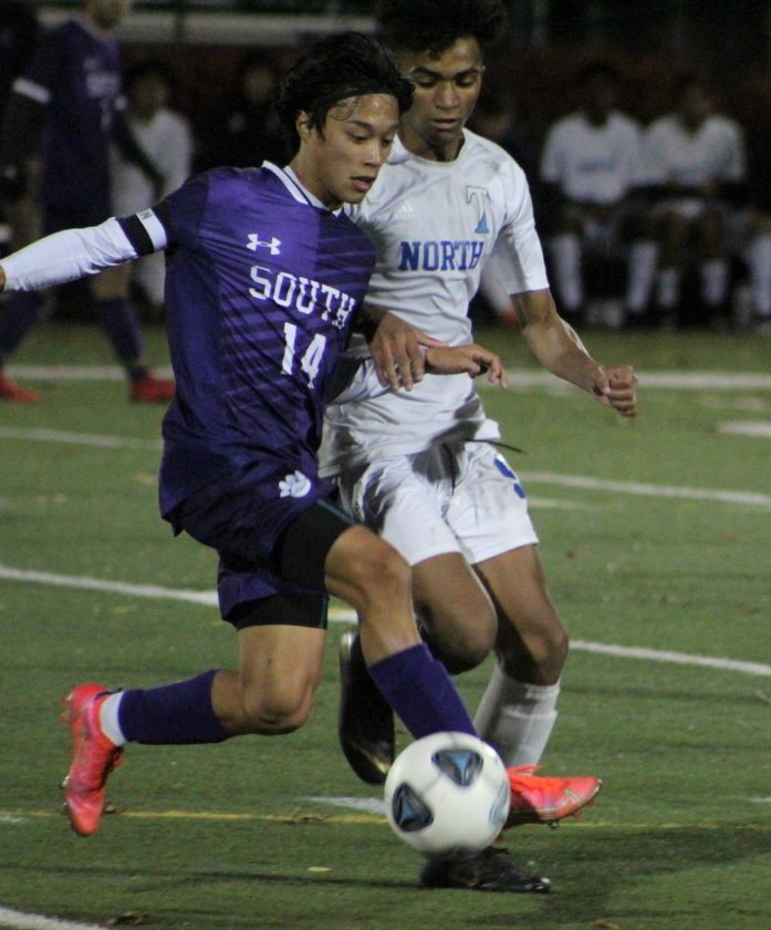 Nashua South's Ethan Emata, left, tries to move against Nashua North's Cam Rodrigues during the epic Division I semifinal this past Monday night at Stellos Stadium. (Telegraph photo by TOM KING)