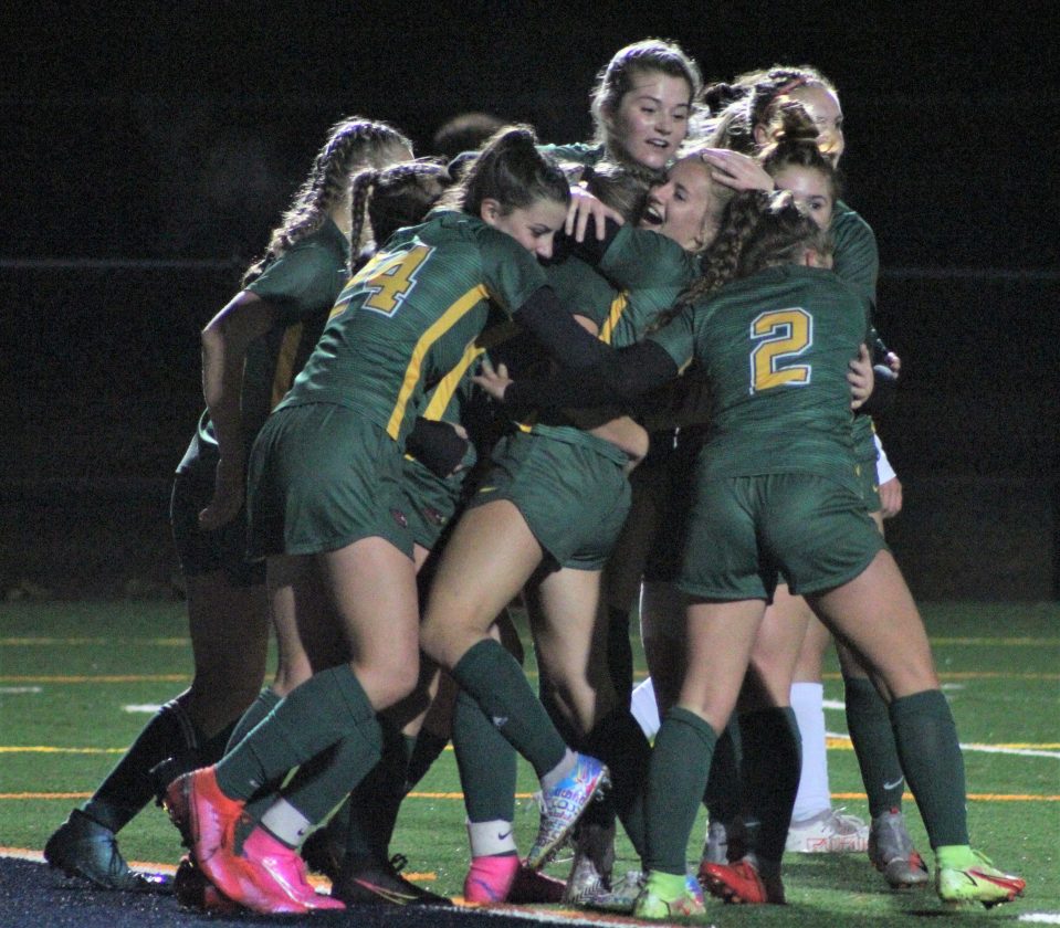 The Bishop Guertin girls soccer players celebrate their go-ahead goal in the second half of thier 4-1 Division I semifinal win over Pinkerton Wednesday night in Exeter. (Telegraph photo by TOM KING)