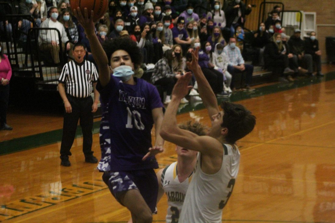 Nashua South's Alize Roig-Cortes drives to the hoop against Bishop Guertn's Tyler Mackey, right, and Matt Santosuosso this past Monday. The two teams saw their Friday games moved to today, as the Panthers will host Manchester Central at 1 p.m. while BG hosts Windham at 3:30. (Telegraph photo by TOM KING)