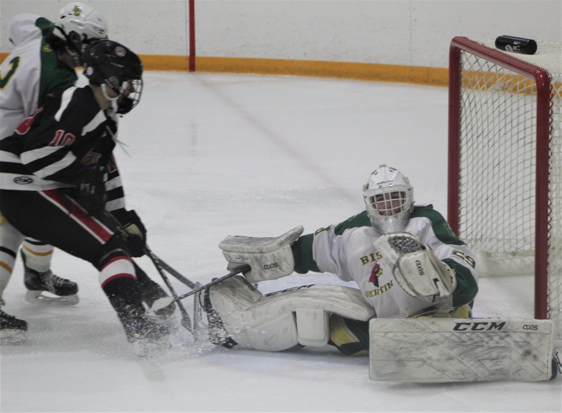 Bishop Guertin goalie P.J. Benites makes one of his 19 saves, this one on Bedford's Jack Dermody, during the Cardinals' 4-0 win over the Bulldogs Saturday at Skate 3. (Telegraph photo by TOM KING)
