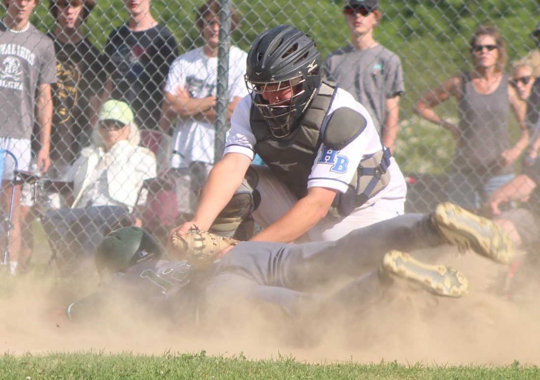 And they were. HB did all its scoring in the first off Knights freshman pitcher Hayden Eastman on Paul Vachon’s two run double, and then held on for dear life. They put runners on base in every inning but the sixth, but got one thrown out at third and another at home.