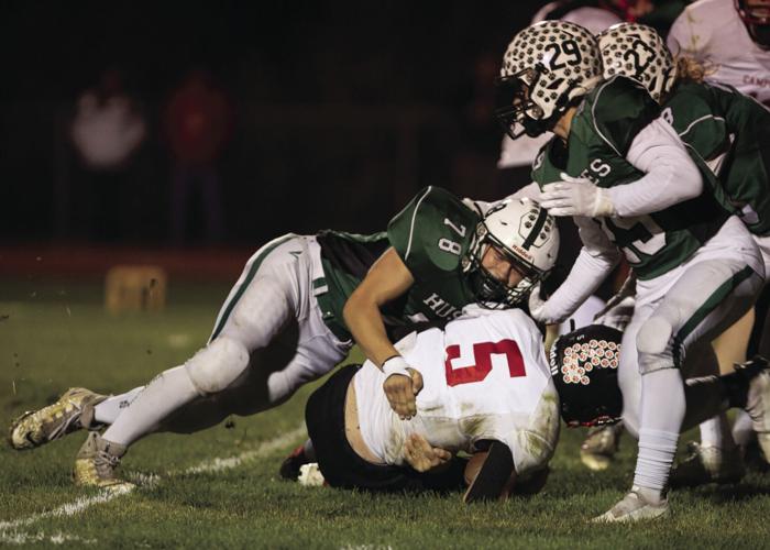 Campbell sophomore Scott Hershberger is tackled by Monadnock senior Anthony Patch during their Division III football semifinal game in Swanzey Friday night. (Photo by Hannah Schroeder / The Keene Sentinel)