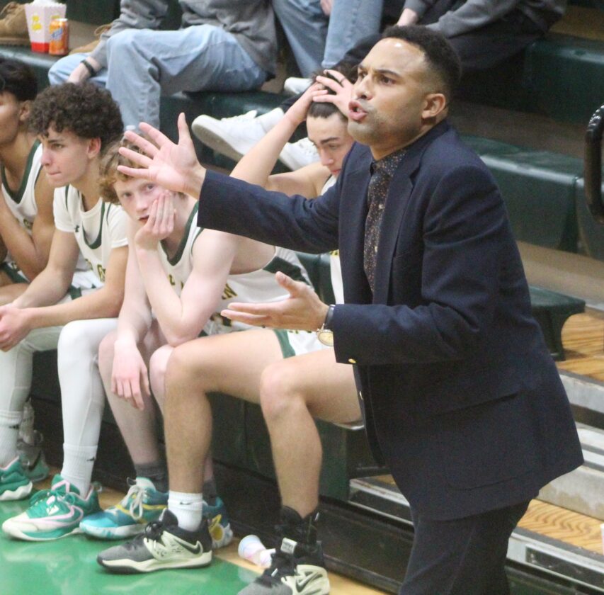 New Bishop Guertin boys basketball coach Will Horne explains some things to his players during a recent practice. (Telegraph photo by TOM KING)