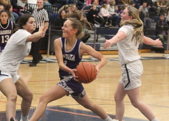 Nashua South’s Katrina O’Donnell drives to the hoop; against North’s Nora Ross, left, and Summer St. Pierre during Friday night’s Battle of the Bridge at Titans Gym. (Telegraph photo by TOM KING)